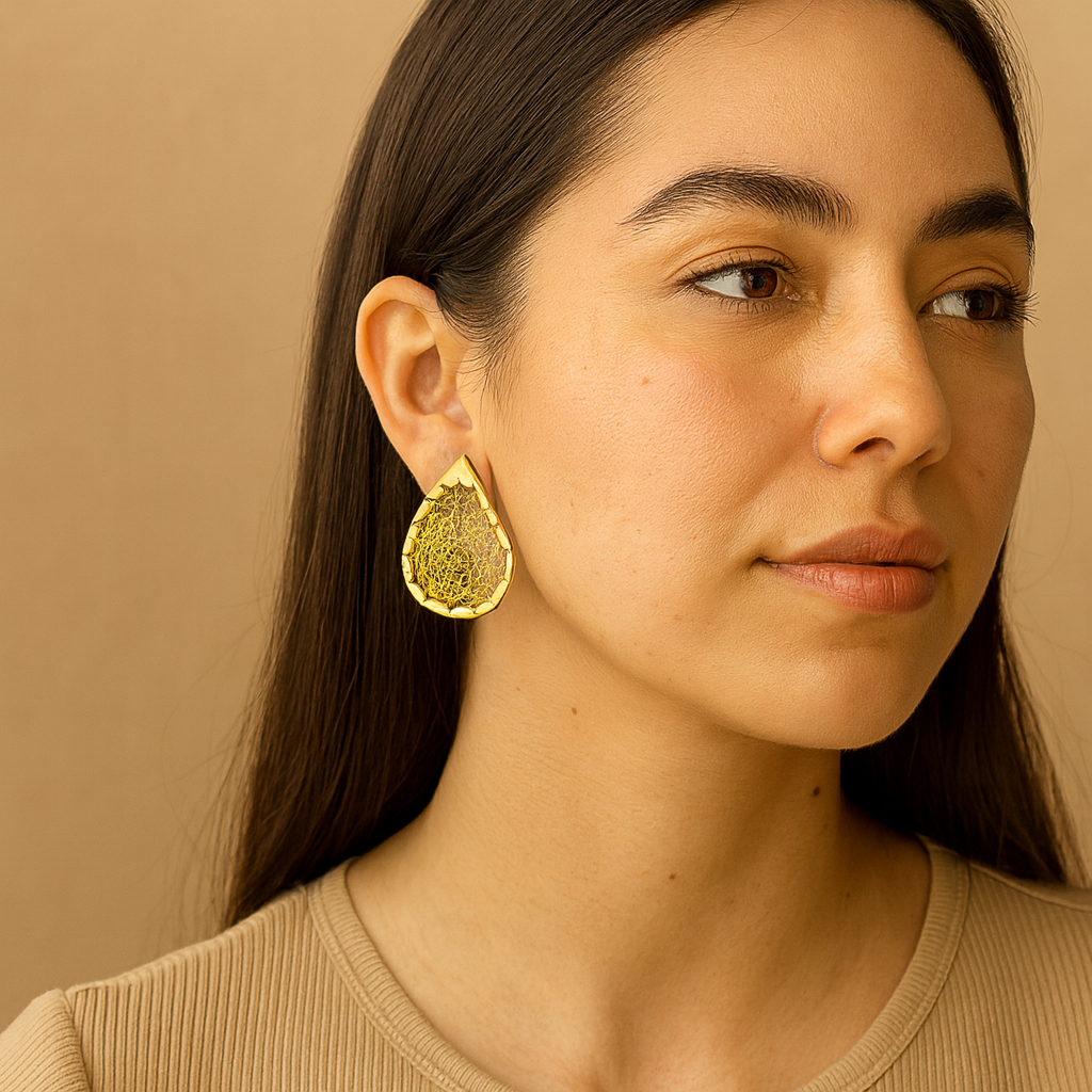 Cada pieza está elaborada con delicado alambrismo en forma de lágrima y un baño de oro de 24 quilates, creando un efecto de red dorada que atrapa la luz y enmarca el rostro con elegancia. Son aretes ligeros, cómodos para usar todo el día y perfectos tanto para outfits casuales como para eventos especiales.